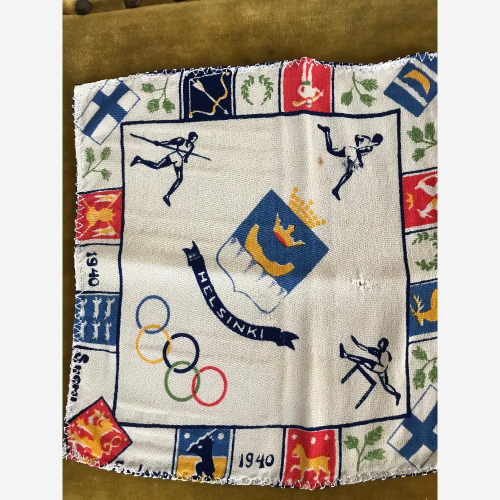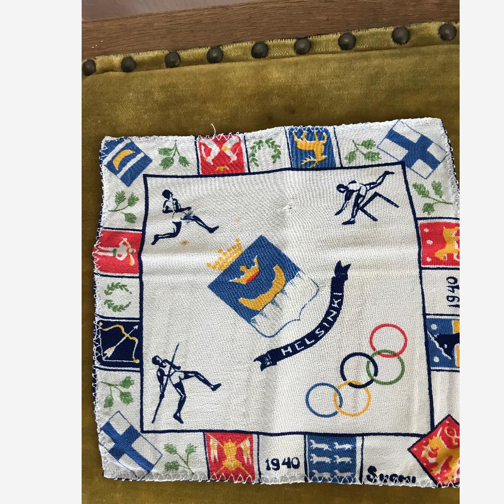 Samlerobjekt fra Olympiaden i Helsinki i 1940. Lille silke lommetørklæde, 20 x 20 cm