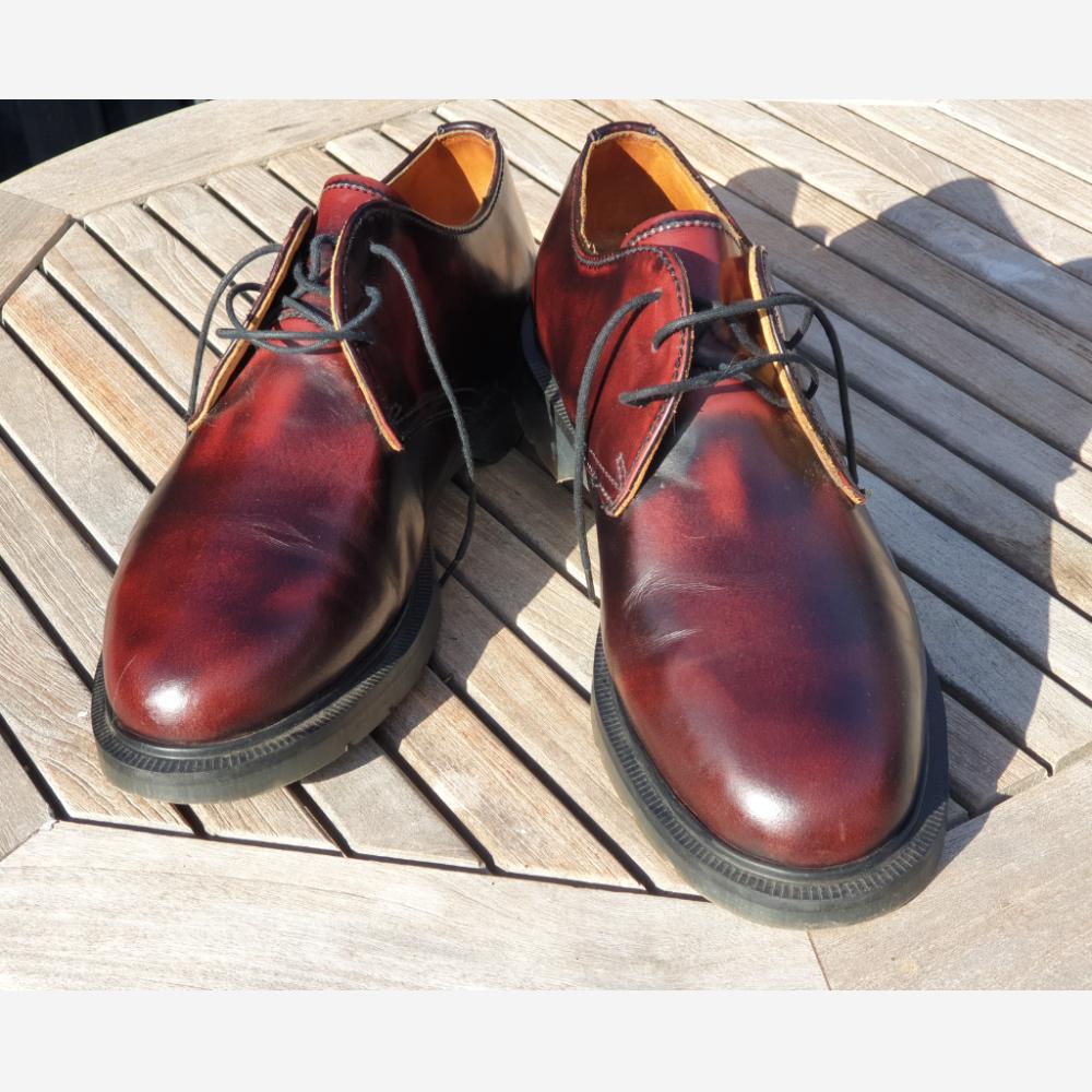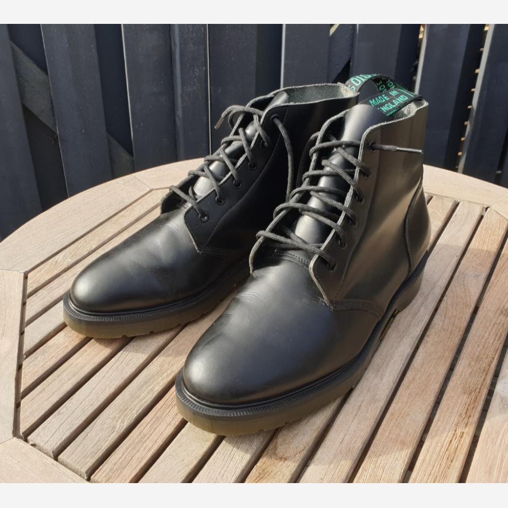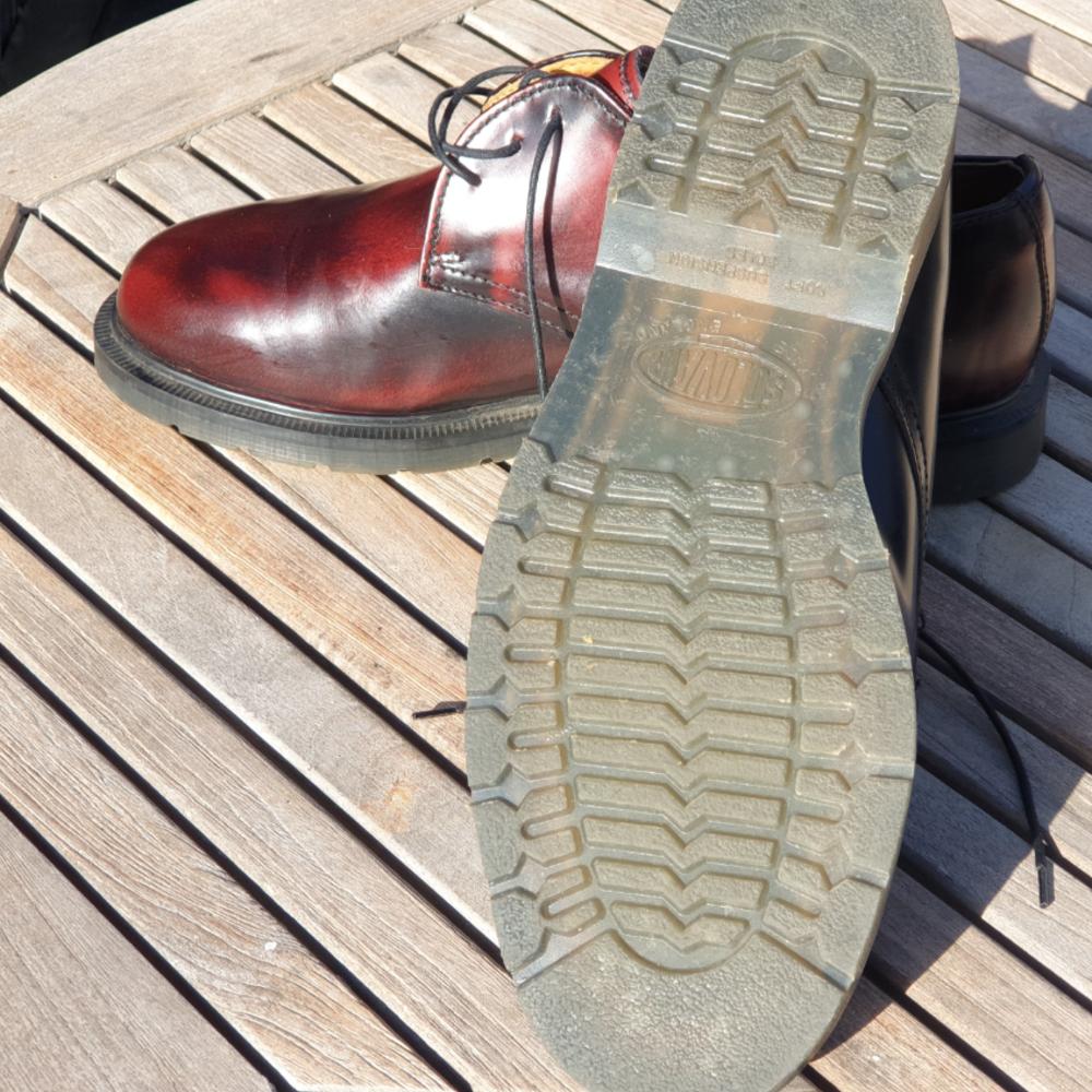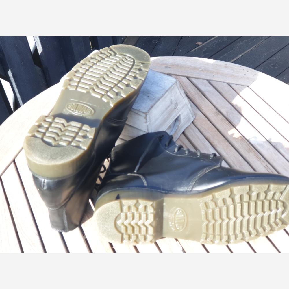 Solovair sko og støvler sælges. De er faktisk ens med Dr.Martens, men ændrede navn, da de splittede fabrikken op. Disse er lavet i England og ikke i østen som Dr.Martens. Som nye. Pga. af knust hælben skal jeg have indlæg i mit fodtøj, og så bliver de for små. Str.43, men lidt lille og smal i pasform. Prisen er pr par.